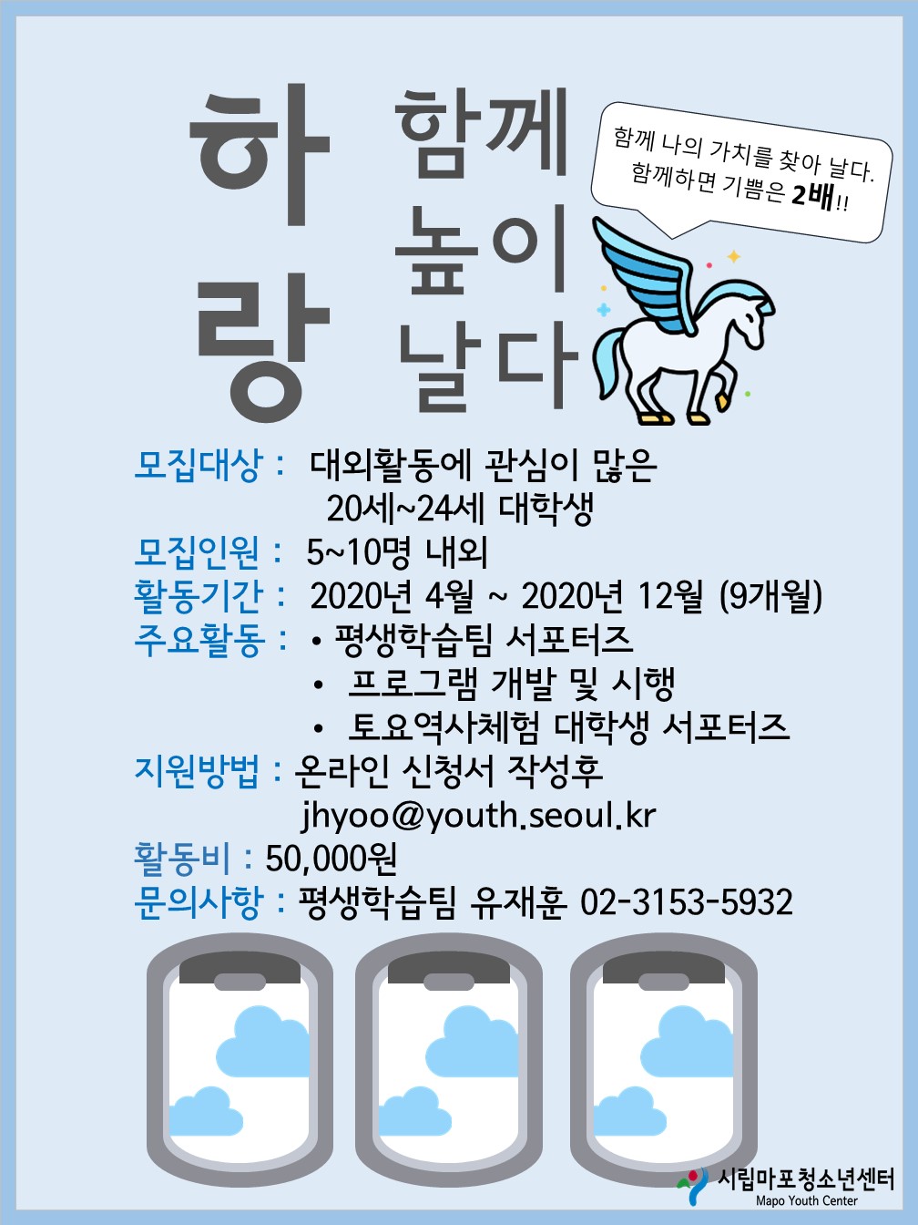 ¸ðÁý´ë»ó: 20¼¼~24¼¼ ´ëÇлý Ȱµ¿±â°£:2020³â 4¿ù ~ 2020³â 12¿ù (9°³¿ù) ÁÖ¿äȰµ¿: * Æò»ýÇнÀÆÀ ¼Æ÷ÅÍÁî * ÇÁ·Î±×·¥ °³¹ß ¹× ½ÃÇà * Åä¿ä¿ª»çüÇè ´ëÇлý ¼Æ÷ÅÍÁî Ȱµ¿ºñ: 50,000¿ø ¹®ÀÇ»çÇ×: Æò»ýÇнÀÆÀ 02)-3153-5932 ½Åû¼ À̸ÞÀÏ: jhyoo@youth.seoul.kr
