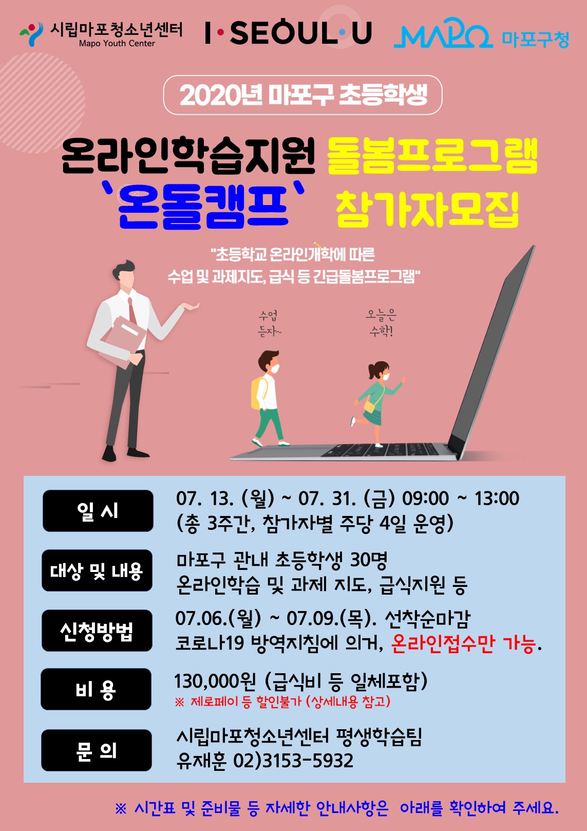 4. ºñ¿ë : 130,000¿ø (±Þ½Äºñ µî ÀÏüÆ÷ÇÔ) ¡Ø ÇØ´ç ÇÁ·Î±×·¥Àº ¸¶Æ÷±¸ ÃʵîÇлýÀ» À§ÇÑ ±ä±Þµ¹º½ Ä·ÇÁ·Î½á, ¾È³»µÈ ºñ¿ëÀº ±âÇÒÀÎµÈ ±Ý¾×À̹ǷÎ, Á¦·ÎÆäÀÌ¡¤´ÙµÕÀÌÇÒÀÎ µî ´Ù¸¥ ÇÒÀμö´Ü°ú Áߺ¹ÇÒÀÎÀÌ ºÒ°¡ÇÕ´Ï´Ù. 5. ¹æ¿ª°ü·Ã ¨ç ÇÁ·Î±×·¥ ¿î¿µ½Ã Äڷγª19·Î ÀÎÇÑ ¼¾ÅÍ ¹æ¿ªÁöħ¿¡ ÀǰÅÇÏ¿©, 1Ãþ Á¤¹®À» Á¦¿ÜÇÑ ³ª¸ÓÁö ÃâÀÔ±¸´Â Æó¼âµË´Ï´Ù.
