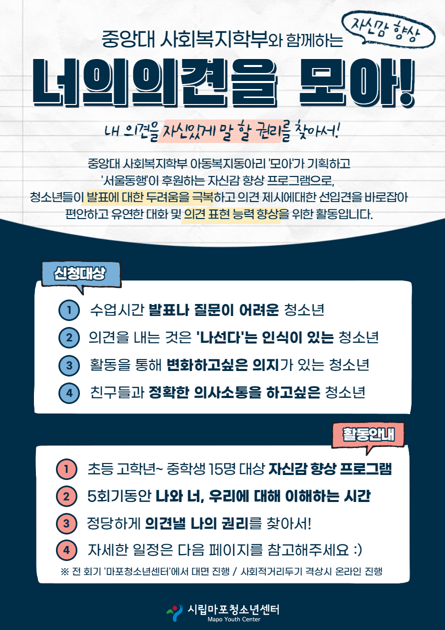 û¼Ò³âµéÀÌ ÀÚ½ÅÀÇ »ý°¢À» Á¤¸®Çϰí Á¤È®È÷ Àü´ÞÇÏ´Â °úÁ¤À» ÅëÇØ ÀڽۨUPUP!! ÀÇ°ß ÇǷ¿¡ ´ëÇÑ µÎ·Á¿ò°ú ¼±ÀÔ°ßÀ» ¾ø¾Ö°íÀÚÇϴ û¼Ò³â ±Ç¸®ÁõÁø ÇÁ·Î±×·¥ÀÔ´Ï´Ù!