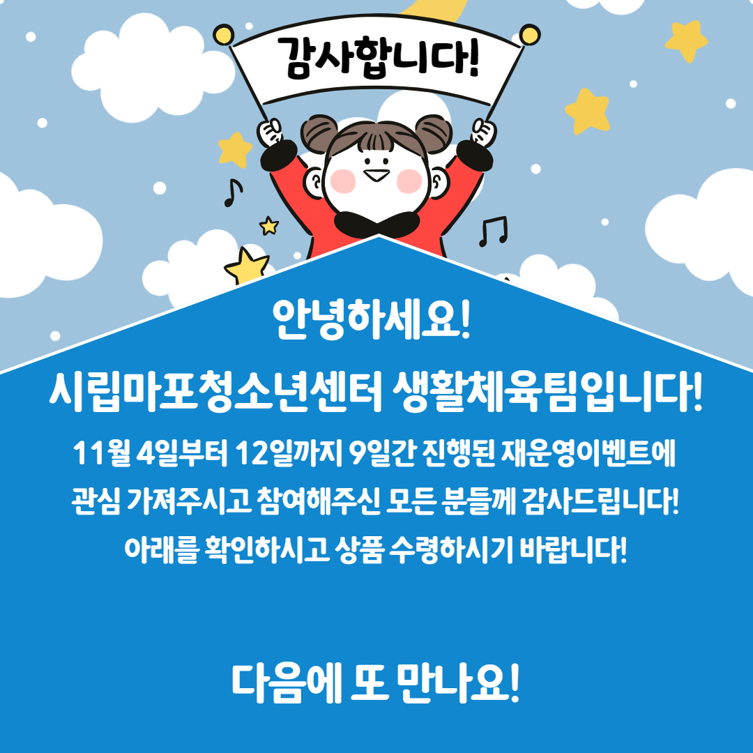 À̺¥Æ® ´ç÷µÇ½Å ºÐµé ¸ðµÎ ÃàÇϵ帳´Ï´Ù! À̺¥Æ® Âü¿©ÇØÁֽЏðµç ºÐµé²² °¨»çµå¸®¸ç ¾ÕÀ¸·Îµµ ½Ã¸³¸¶Æ÷û¼Ò³â¼¾ÅÍ¿¡ ´ëÇÑ °ü½É°ú »ç¶û ºÎʵ右´Ï´Ù! ´ÙÀ½¿¡ ¶Ç ¸¸³ª¿ä! °¨»çÇÕ´Ï´Ù:)