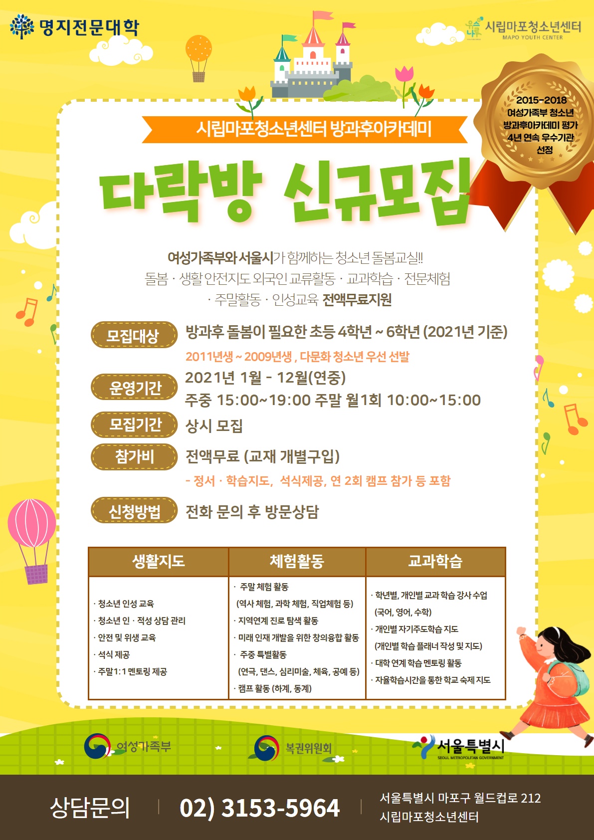 3. Á¢¼ö¹æ¹ý ¨ç Àüȹ®ÀÇ ¹æ¹®½Ã°£ ÇùÀÇ ÈÄ ¸é´ã ¹× Á¢¼ö¼·ù ¿øº»Á¦Ãâ ¡ØÇÊÈ÷ ¹æ¹®À» ¿äÇÔ ¨è ÀüȾȳ»: 02)3153-5964 ÁÖ ¼Ò - ¼¿ï½Ã ¸¶Æ÷±¸ ¿ùµåÄÅ·Î 212 ¸¶Æ÷û¼Ò³â¼¾ÅÍ ¹æ°úÈľÆÄ«µ¥¹Ì ÆÀÀå À̼øÁö ¨é ½Åû¼·ù: Áö¿ø´ë»óÀÚº° ±¸ºñ¼·ù ¸é´ã ½Ã °³º°¾È³» ¨ë Á¢¼ö±â°£: ¸¶°¨½Ã ±îÁö