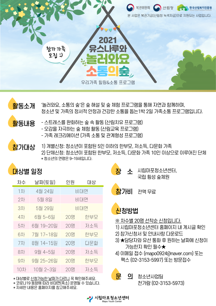 ¡Ú ¸ðÁý´ë»ó¿¡ ÇØ´çÇÏÁö ¾Ê´Â °¡Á·À¯ÇüÀÇ ½Åû¹®ÀÇ´Â ÀüÈ (02-3153-5973) ¹Ù¶ø´Ï´Ù! * ¹Ýµå½Ã ÷ºÎÆÄÀÏ(¾È³»»çÇ×, Âü°¡½Åû¼ ¾ç½Ä) È®ÀÎÇϽñ⠹ٶø´Ï´Ù :) * 5¿ù Ȱµ¿Àº Àü¸é ºñ´ë¸éÀ¸·Î ¿î¿µµÉ ¿¹Á¤ÀÔ´Ï´Ù. |