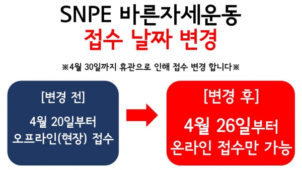 5¿ù SNPE ¹Ù¸¥ÀÚ¼¼¿îµ¿ Á¢¼ö ÀÏÁ¤ º¯°æÀÔ´Ï´Ù.