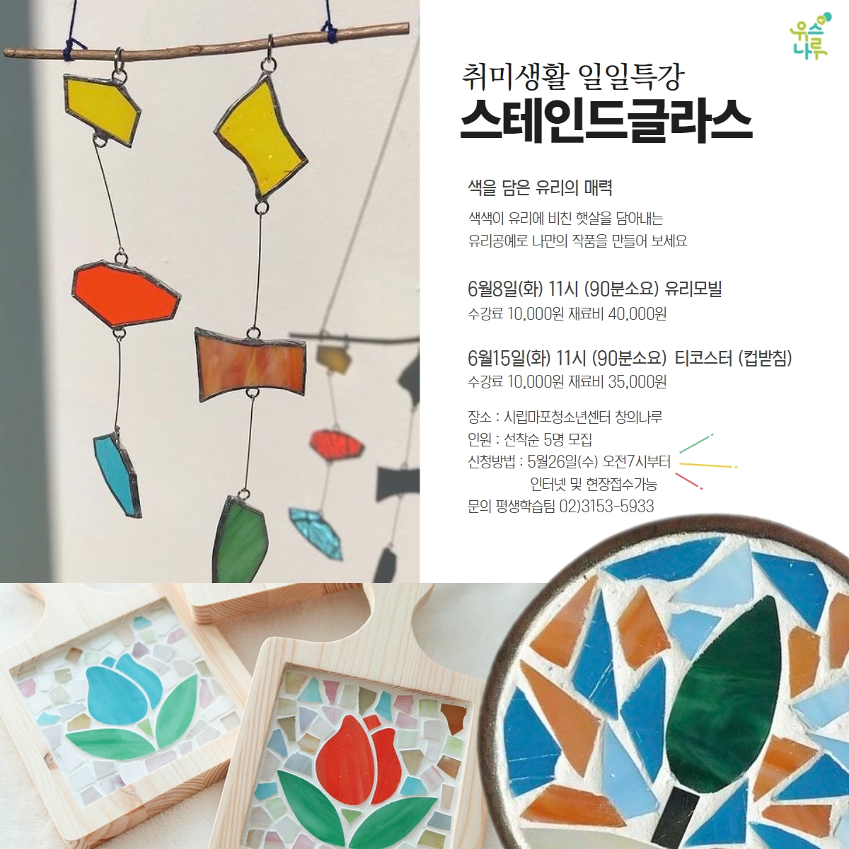 6¿ù8ÀÏ(È) 11½Ã (90ºÐ¼Ò¿ä) À¯¸®¸ðºô¸¸µé±â ¼ö°·á 10,000¿ø Àç·áºñ 40,000¿ø 6¿ù15ÀÏ(È)11½Ã (90ºÐ¼ö¿ä) ƼÄÚ½ºÅÍ(ÄŹÞħ)¸¸µé±â ¼ö°·á 10,000¿ø Àç·áºñ 35,000¿ø