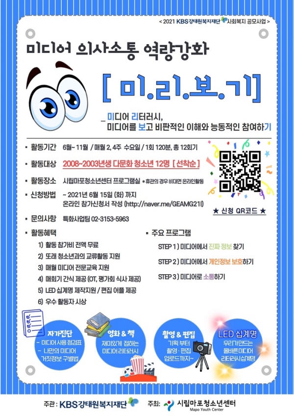 ¡¸2021³â KBS°Å¿øº¹ÁöÀç´Ü »çȸº¹Áö°ø¸ð»ç¾÷ <¹Ì.¸®.º¸.±â> Âü¿© û¼Ò³â ¸ðÁý¾È³»¡¹ - Ȱµ¿³»¿ë: û¼Ò³â ¹Ìµð¾î¿ª·®°È ÇÁ·ÎÁ§Æ®- ¹Ìµð¾î ¸®ÅÍ·¯½Ã - Ȱµ¿Àå¼Ò: ´ë¸é(½Ã¸³¸¶Æ÷û¼Ò³â¼¾ÅÍ) *ºñ´ë¸éÀÇ °æ¿ì ºñ´ë¸é(ZOOM) ¿Â¶óÀΠȰµ¿ - Âü¿©´ë»ó: 2008~2003³â»ý ´Ù¹®È û¼Ò³â 12¸í - Âü °¡ ºñ: Àü¾× ¹«·áÁö¿ø - ½Åû¹æ¹ý: °³ÀνÅû, ¿Â¶óÀÎ ½Åû Á¢¼ö(http://naver.me/GEAMG21I) #÷ºÎ Æ÷½ºÅÍ È®ÀÎ - ¸ðÁýÀϽÃ: 2021³â 6¿ù 15ÀÏ(È)±îÁö - ¹®ÀÇ»çÇ×: ƯȻç¾÷ÆÀ 02-3153-5963