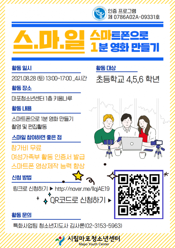 û¼Ò³â¼ö·ÃȰµ¿ÀÎÁõÁ¦°¡ ¹«¾ùÀΰ¡¿ä? û¼Ò³âÀÌ ¾ÈÀüÇϰí À¯ÀÍÇÑ Ã»¼Ò³âȰµ¿¿¡ Âü¿©ÇÒ ¼ö ÀÖµµ·Ï ÀÏÁ¤±âÁØ¿¡ µû¶ó ½É»çÇÏ¿© ÇÁ·Î±×·¥À» ÀÎÁõÇÏ´Â ±¹°¡ÀÎÁõÁ¦µµÀÔ´Ï´Ù. ÀÎÁõ¼ö·ÃȰµ¿¿¡ Âü¿©ÇÏ¸é ¾î¶² ÁÁÀº Á¡ÀÌ ÀÖ³ª¿ä? ¾ðÁ¦ ¾îµð¼³ª ÀÎÁõ¼ö·ÃȰµ¿¿¡ Âü¿©ÇϽбâ·ÏÀº eû¼Ò³â¿¡¼ ½Ç½Ã°£ ¹ß±ÞÀÌ °¡´ÉÇÕ´Ï´Ù. Âü¿©Çß´ø ¼Ò°¨, »çÁø µîÀ» ³Ö¾î Æ÷Æ®Æú¸®¿À¸¦ ½º½º·Î ÀÛ¼ºÇÏ¿© °ü¸® ÇÒ ¼ö ÀÖ½À´Ï´Ù. [½º.¸¶.ÀÏ]_ ½º¸¶Æ®ÆùÀ¸·Î 1ºÐ ¿µÈ ¸¸µé±â ½º¸¶Æ®ÆùÀ» ÅëÁ¦ÀÇ ´ë»óÀÌ ¾Æ´Ï¶ó ±³À° ¹× üÇè ¼ö´ÜÀ¸·Î ½º¸¶Æ®ÆùÀ» Ȱ¿ëÇÑ ¿µ»ó Á¦ÀÛ È°µ¿À» ÅëÇØ ¹Ìµð¾î °ü·Ã ¿ª·®À» °³¹ßÇÏ¿© ¹Ìµð¾î Ȱ¿ë¿¡ ´ëÇÑ ¿Ã¹Ù¸¥ ÀνÄÀ» ÇÔ¾çÇÔÀ¸·Î½á âÀÇÀûÀ̰í ÁÖµµÀûÀΠû¼Ò³âÀ¸·Î ¼ºÀåÇÒ ¼ö ÀÖµµ·Ï ÇÑ´Ù. Ȱµ¿ÀϽÃ: 2021.08.28 (Åä) 13:00~17:00 (4½Ã°£) Ȱµ¿´ë»ó: ÃʵîÇб³ 4~6Çг⠼±Âø¼ø 15¸í ¸ðÁý Ȱµ¿Àå¼Ò: ¸¶Æ÷û¼Ò³â¼¾ÅÍ 1Ãþ Ű¿ò³ª·ç Ȱµ¿³»¿ë - Àü¹® °»ç´ÔÀÇ ¹Ìµð¾î ÄÜÅÙÃ÷ Á¦ÀÛ±³À° - ½º¸¶Æ®ÆùÀ¸·Î 1ºÐ ¿µÈ ¸¸µé±â - ÃÔ¿µ ¹× ÆíÁýȰµ¿ Ȱµ¿Âü¿©ÇýÅà - Âü°¡ºñ Àü¾× ¹«·á - ¿©¼º°¡Á·ºÎ Ȱµ¿ ÀÎÁõ¼ ¹ß±Þ - ½º¸¶Æ®Æù ¿µ»óÁ¦ÀÛ ´É·Â Çâ»ó ½Åû¹æ¹ý -¸µÅ©·Î ½ÅûÇϱâ - Å¥¾ËÄÚµå·Î ½ÅûÇϱâ Ȱµ¿¹®ÀÇ Æ¯È»ç¾÷ÆÀ 02-3153-5963