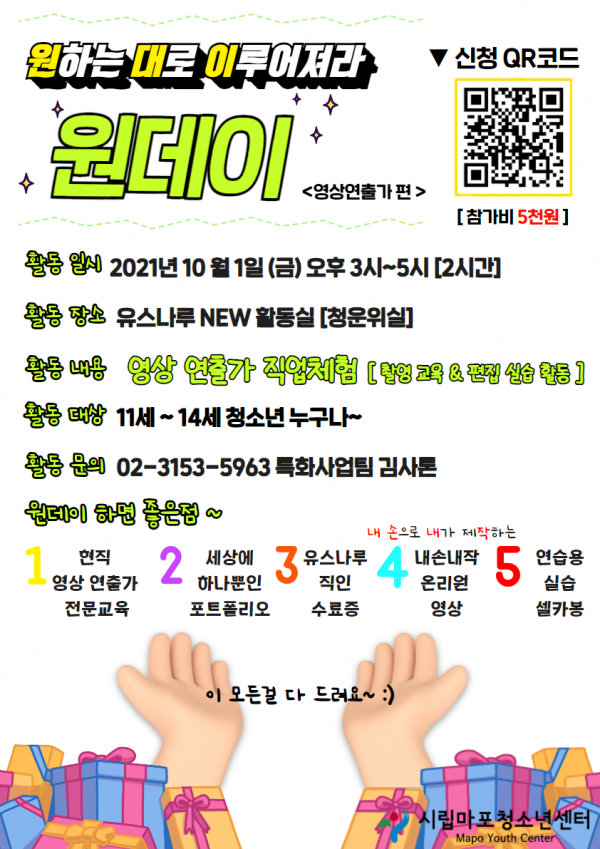 Ȱµ¿ÀϽÃ: 2021³â 10¿ù 1ÀÏ (±Ý) ¿ÀÈÄ3½Ã~5½Ã (2½Ã°£ ¿î¿µ) Ȱµ¿Àå¼Ò: À¯½º³ª·ç newȰµ¿½Ç (2021 9¿ù »õ·Ó°Ô ¸®¸ðµ¨¸µ ¿Ï·áÇÑ È°µ¿½Ç ÀÔ´Ï´Ù^^) Ȱµ¿´ë»ó: 11¼¼~14¼¼ û¼Ò³â ´©±¸³ª Âü°¡ºñ: 1ÀÎ 5õ¿ø Ȱµ¿³»¿ë: 1) ¿µ»ó ¿¬Ãâ°¡ Á÷¾÷üÇè 2) ¹æ¼Û& ¹Ìµð¾î °ü·Ã ÃÔ¿µ Àü¹®±³À° 3) ¿µ»ó¿¬Ãâ°¡ Á÷¾÷ ¼Ò°³ 4) ¿µ»ó ÃÔ¿µ ¹× Á¦ÀÛ ½Ç½ÀȰµ¿