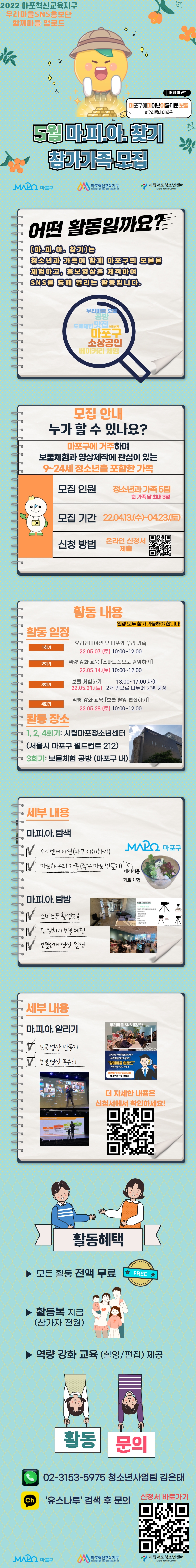 ¢º ¸ðÁý ´ë»ó ¹× Àοø - ´ë»ó: ¸¶Æ÷±¸¿¡ °ÅÁÖÇÏ´Â 9~24¼¼ û¼Ò³â°ú °¡Á· - Àοø: ¼±Âø¼ø [5ÆÀ] * ÇÑ °¡Á·´ç ÃÖ´ë 3¸í ½Åû °¡´É ¡Ø °¡Á·Àº ÃÖ´ë 3ÀÎ ½Åû °¡´ÉÇϸç, Á¦ÇÑÀοø(15¸í) ³» ¼±¹ß °¡Á·Àº º¯°æµÉ ¼ö ÀÖ½À´Ï´Ù. ¡Ø °¡Á· ´ç 1¸íÀÇ ¸àÅä(û¼Ò³â/¿µ»ó °ü·Ã Àü°øÀÚ)°¡ ¹èÄ¡µË´Ï´Ù.