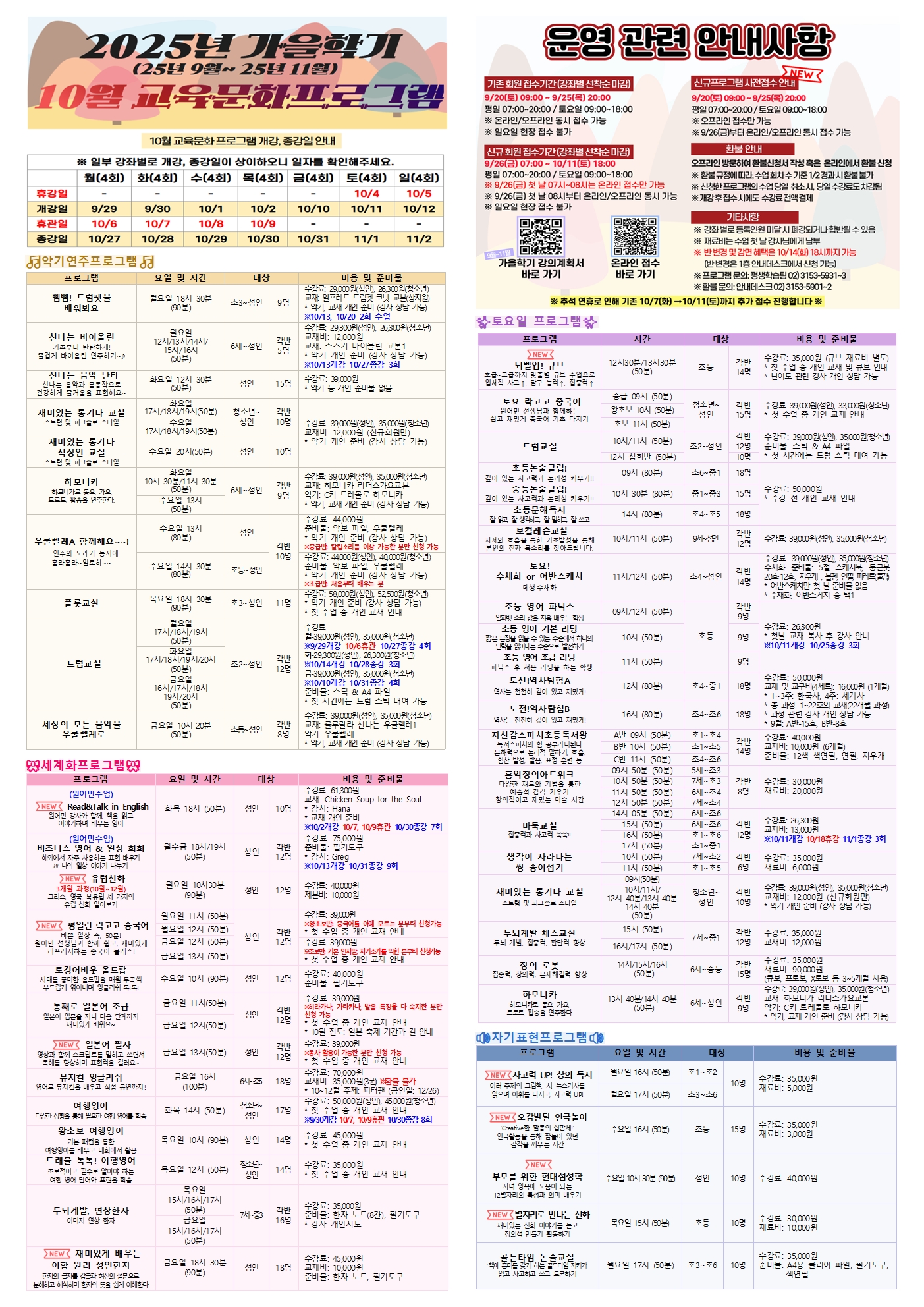 | [2025³â °¡À»Çбâ] 10¿ù ±³À°¹®È&»ýȰüÀ° ÇÁ·Î±×·¥ Àü´ÜÁö ¾È³» | |||