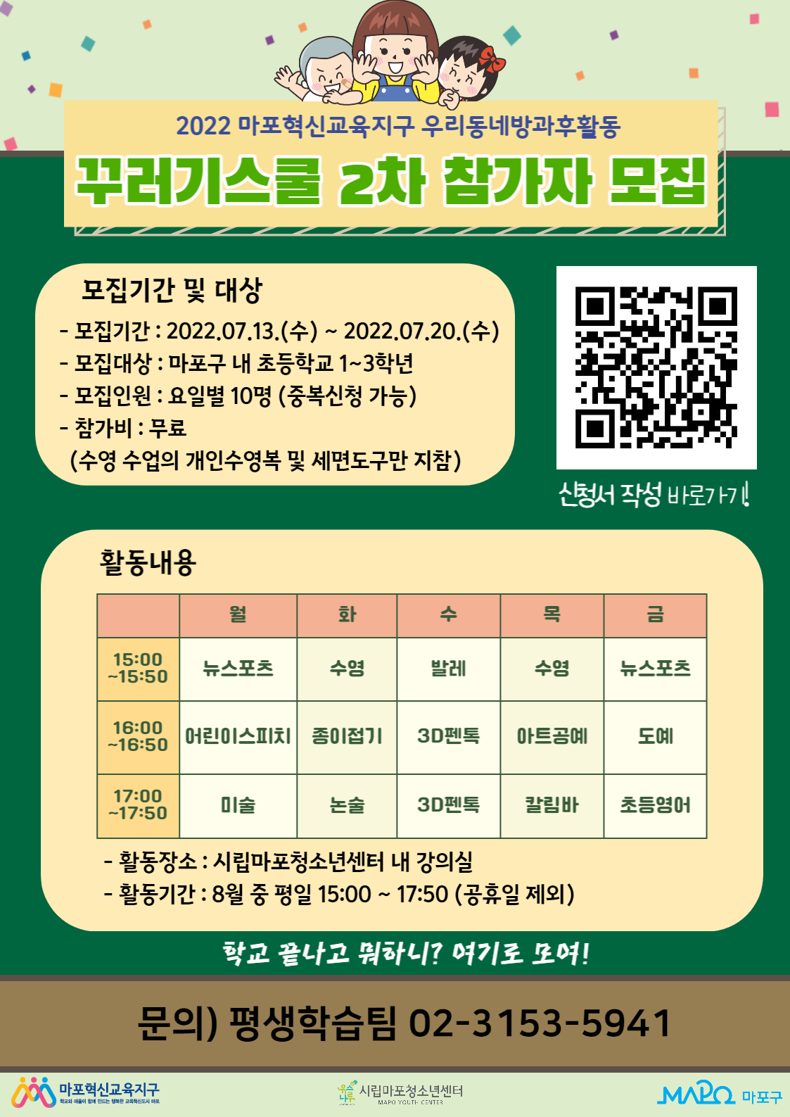 2022³â ¸¶Æ÷Çõ½Å±³À°Áö±¸ Áö¿ø»ç¾÷ ¿ì¸®µ¿³×¹æ°úÈÄȰµ¿ ²Ù·¯±â½ºÄð 2Â÷(8¿ù) Âü°¡ÀÚ¸¦ ¸ðÁýÇÕ´Ï´Ù.
