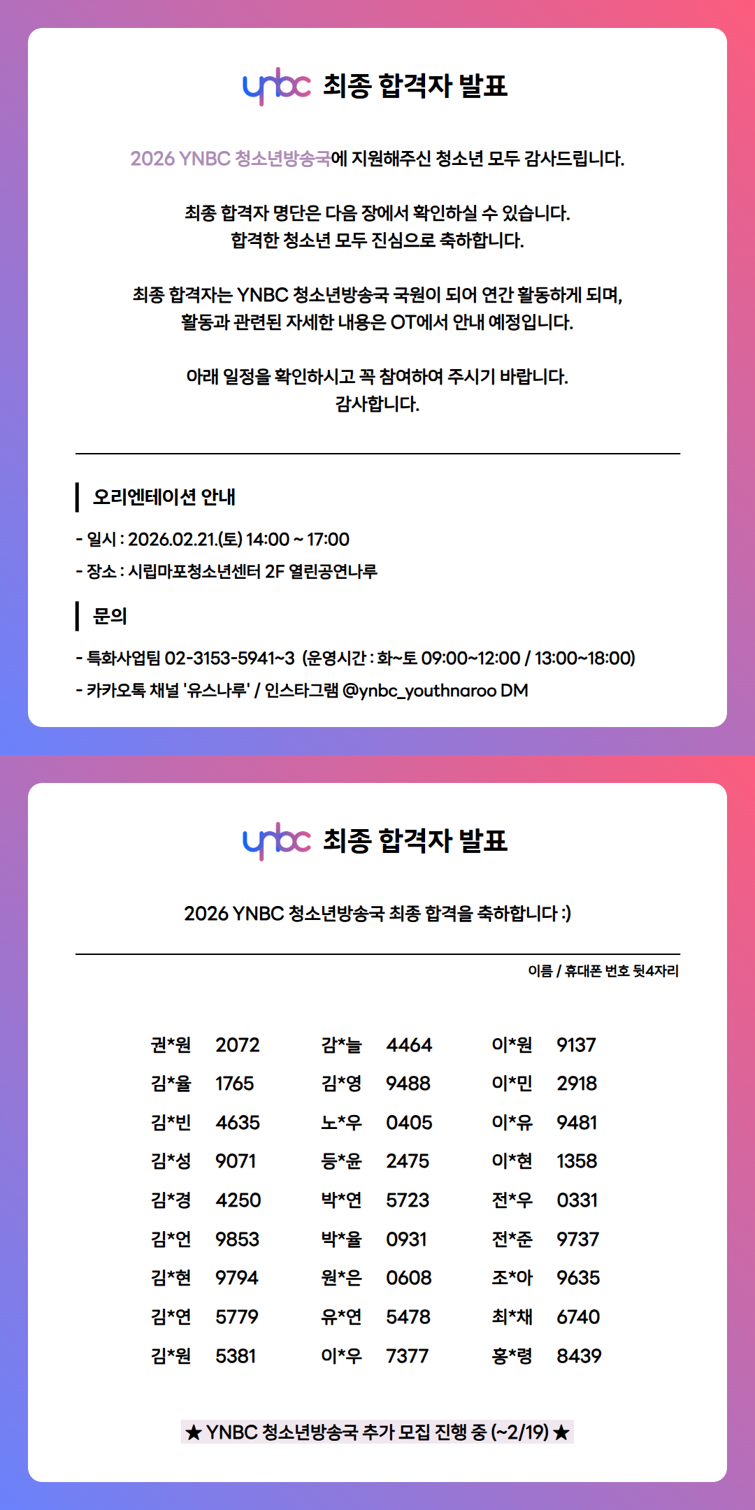 [û¼Ò³âȰµ¿] 2026 YNBC û¼Ò³â¹æ¼Û±¹ ÃÖÁ¾ ÇÕ°ÝÀÚ ¹ßÇ¥