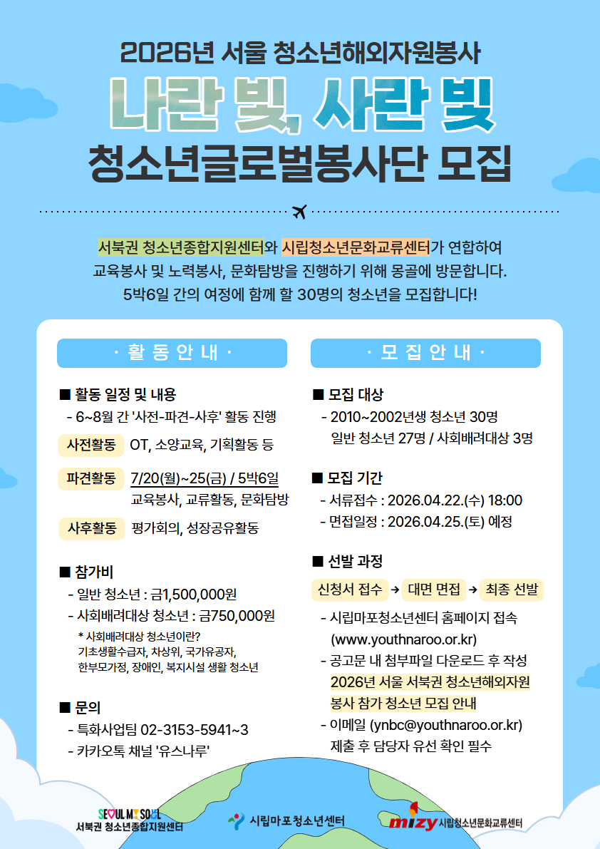 º» Ȱµ¿Àº ¼ºÏ±Ç û¼Ò³âÁ¾ÇÕÁö¿ø¼¾ÅÍ¿Í ½Ã¸³Ã»¼Ò³â¹®È±³·ù¼¾ÅͰ¡ ÇÔ²² ¿î¿µµË´Ï´Ù. û¼Ò³âÀÇ ±Û·Î¹ú ½Ã¹Î¼º ÇÔ¾ç°ú ³ª´®ÀÇ °¡Ä¡¸¦ ½ÇõÇÏ´Â ¶æ±íÀº ±¹Á¦±³·ù¡¤ÀÚ¿øºÀ»çȰµ¿ÀÔ´Ï´Ù.