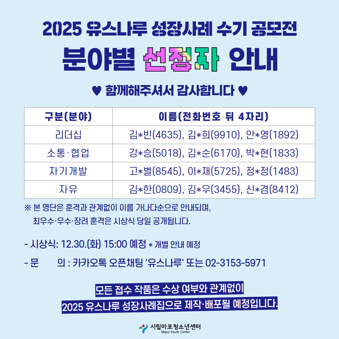 ½Ã¸³¸¶Æ÷û¼Ò³â¼¾ÅÍ(À¯½º³ª·ç)´Â ¡¸2025 À¯½º³ª·ç ¼ºÀå»ç·Ê ¼ö±â °ø¸ðÀü¡¹À» ¸¶¹«¸®Çϰí, ±× °á°ú¸¦ ´ÙÀ½°ú °°ÀÌ ¾È³»µå¸³´Ï´Ù.