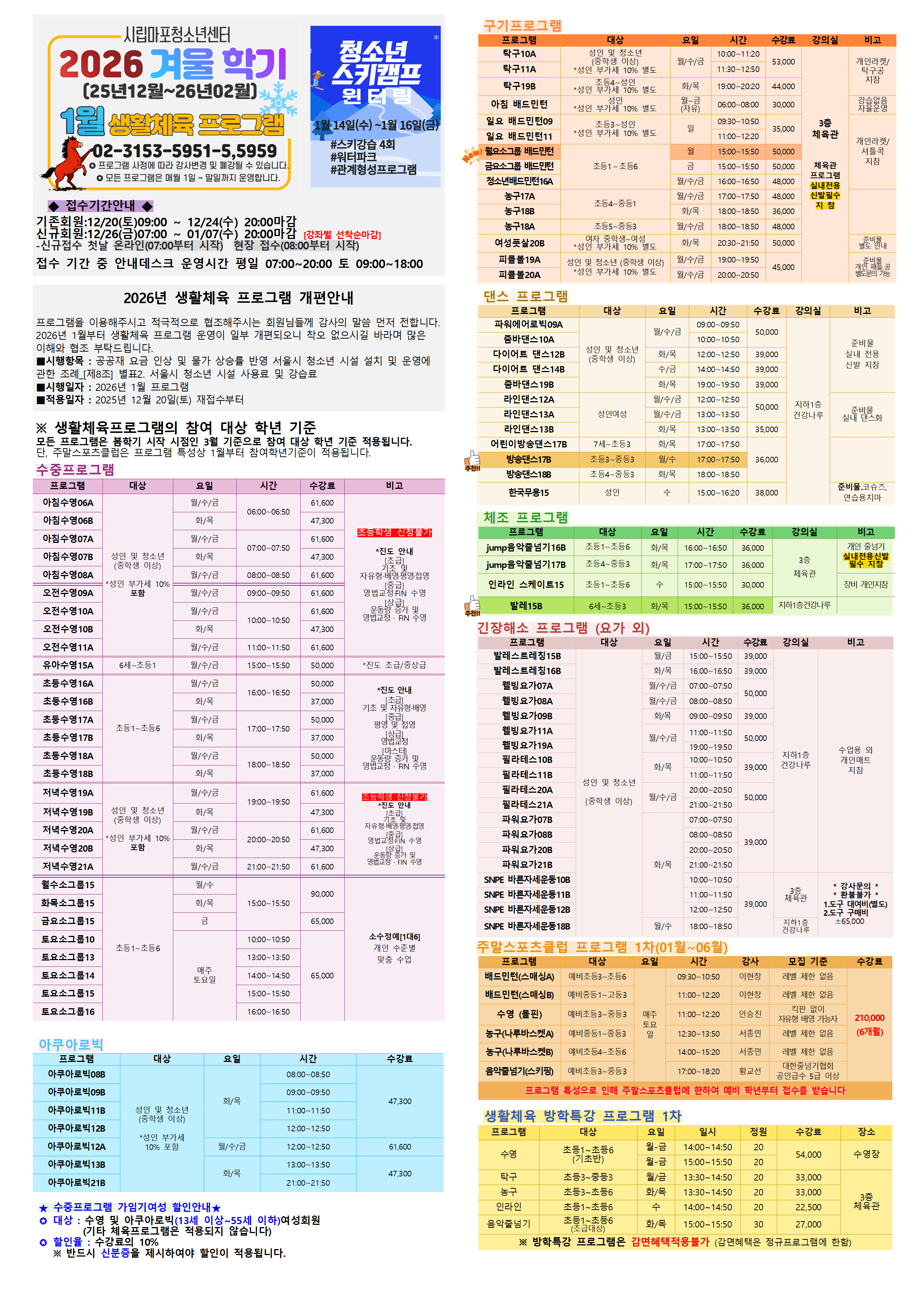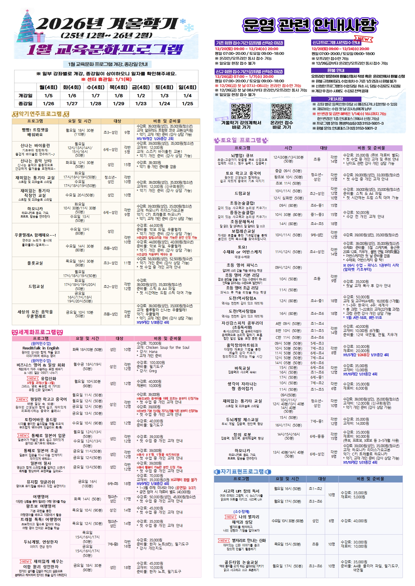| [2026³â °Ü¿ïÇбâ] 1¿ù ±³À°¹®È&»ýȰüÀ° ÇÁ·Î±×·¥ Àü´ÜÁö ¾È³» | |||