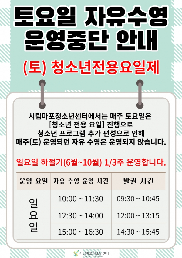 | ÆÄÀÏ÷ºÎ | ÁÖ¸» ÀÚÀ¯¼ö¿µ °ü·Ã °øÁö.jpg ÀÏ¿äÀÚÀ¯¼ö¿µ¿î¿µÇ¥.png ÀÏ¿äÀÚÀ¯¼ö¿µ[À¯¾Æ³ªÀÌÁ¦ÇѰøÁö].png | |||||