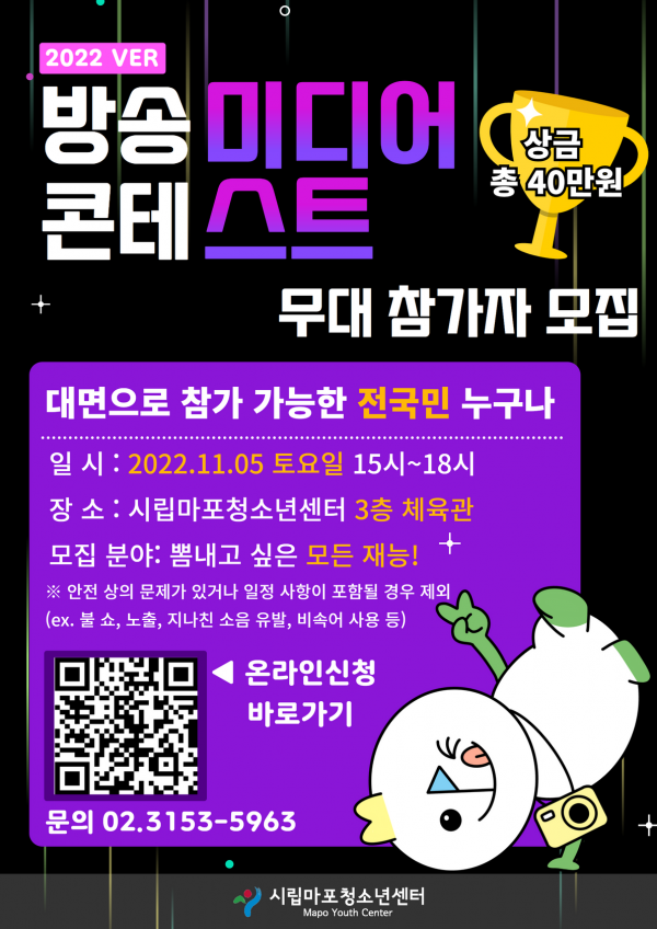 ¢¾ ÀϽÃ: 2022. 11. 05. (Åä) 15:00~18:00¢¾ Àå¼Ò: ½Ã¸³¸¶Æ÷û¼Ò³â¼¾ÅÍ 3Ãþ üÀ°°ü¢¾ ´ë»ó: ´ë¸éÀ¸·Î ¹«´ë Âü°¡ °¡´ÉÇÑ Àü ±¹¹Î °¡´É¢¾ ¸ðÁý ºÐ¾ß: »Ë³»°í ½ÍÀº ¸ðµç Àç´É °¡´É ! ½Åû ¤¡¤¡~ ¿¹½Ã: ¿¬±â, ¸¶¼ú, ¸¶ÀÓ, ¹«¼ú, ¿ä¿ä µî¡Ø ¾ÈÀü »óÀÇ ¹®Á¦°¡ Àְųª ÀÏÁ¤ »çÇ×ÀÌ Æ÷Ç﵃ °æ¿ì Á¦¿Ü(ex. ºÒ ¼î, ³ëÃâ, Áö³ªÄ£ ¼ÒÀ½ À¯¹ß, ºñ¼Ó¾î »ç¿ë µî)