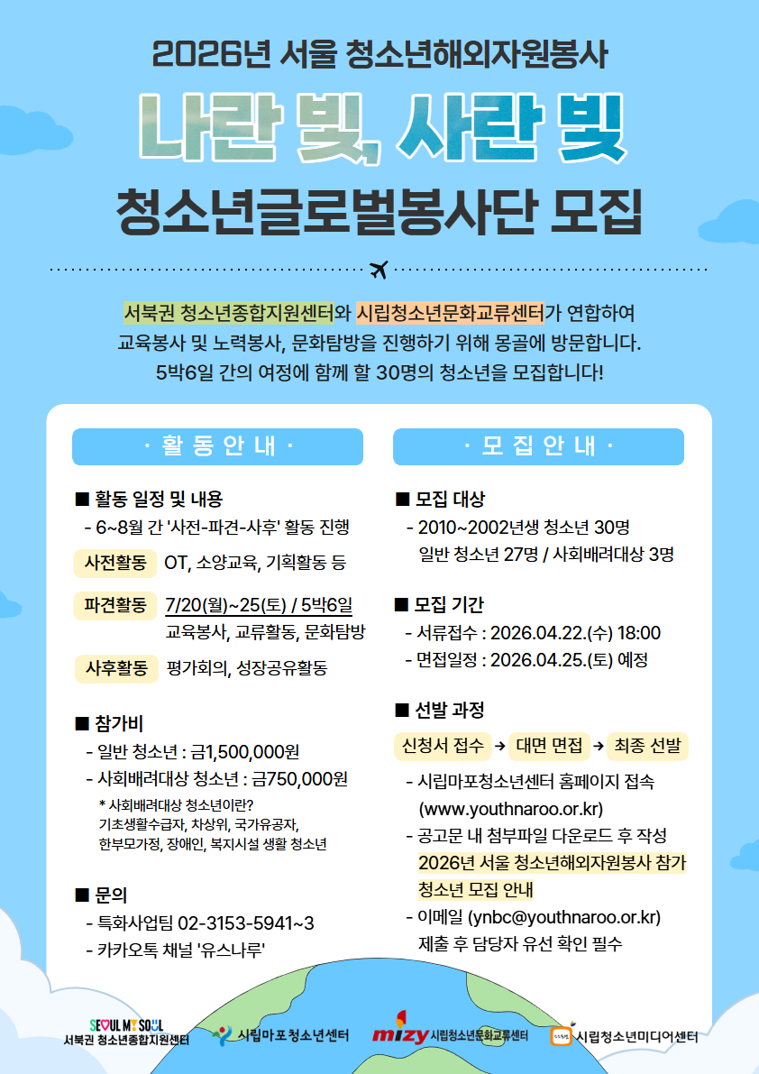| ÆÄÀÏ÷ºÎ | 2026³â ¼¿ï û¼Ò³âÇØ¿ÜÀÚ¿øºÀ»ç Âü°¡ÀÚ ¸ðÁý ¾È³» ¹× ½Åû¼(¾ç½Ä).hwp | |||||